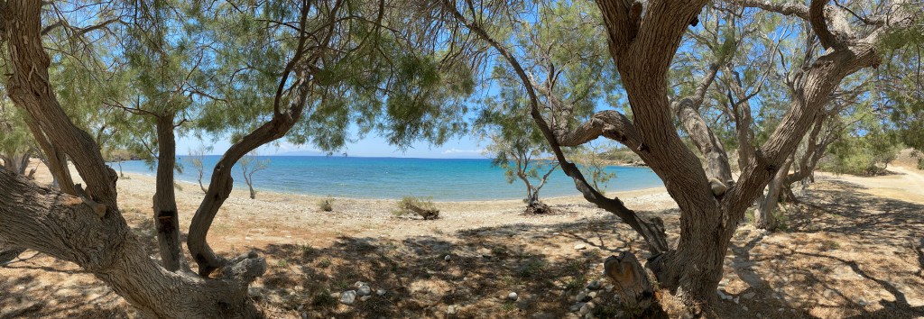 Having done a bit of prior research, I knew Koufonisia is best known for its beaches and we were not disappointed. Every cove had something attractive about it, be it an established place to swim – with steps down from the road / track – or one which requires some clambering down to. They invariably have a bit of sand to pitch up on, crystal-clear waters and a nudist not visible from the road – most of whom seem completely unfazed by the arrival of two semi-clad interlopers. So far, our best snorkelling was on Koufonisia: shoals of whitebait, sticklebacks, catfish, plaice, pipefish and rainbow wrasse, which might seem unremarkable, but all this in a few feet of water, and all of which seemed remarkably tame.