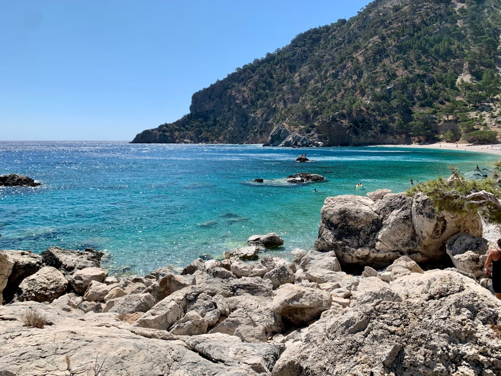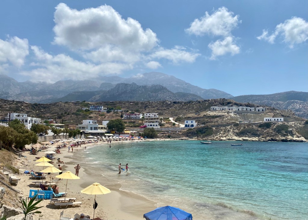 Like many other Greek islands, Karpathos – we found out – is famed for its beaches (and hiking trails, although it was a little hot for walks over large mountains). However, unlike some other islands, they were further apart and treacherous to get to as the island is long and thin – c. 30 miles in length – with peaks reaching some 3,600 feet in the middle which makes for some spectacular scenery and some equally terrifying driving escapades. The layout is not dissimilar to Great Britain: much of the action is in the south east, the best beaches are on the west or south west coasts and the north is more sparsely populated but with some outstanding photo-fodder. The roads, whilst being newly paved (at least relative to other island roads we have driven along in Greece), were partially single-track, while being two-way, littered with fallen rock on the inside of the mountain and with a sheer, unbroken drop of varying heights, but certainly several hundred feet at a minimum on the other side.