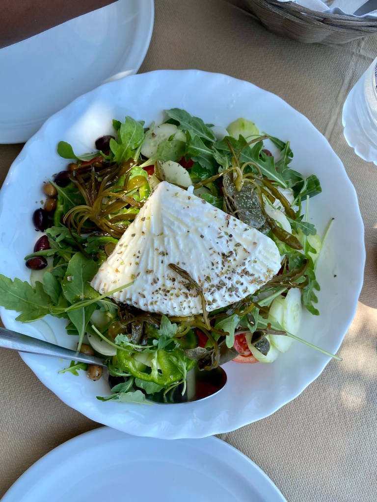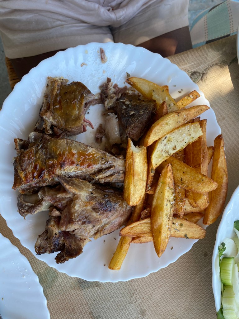 Driving (carefully) around Karpathos we visited Olympos, a lovely hilltop town, Diafani, this time knowingly and by road, and Lefkos, a tiny but bustling seaside village, which mightn’t stay a village for long as it becomes better known. We also stopped at a tavena where we had one of our best – or certainly most authentic – and windiest meals in Greece at Taverna Evdoxias (I promised myself I would try and avoid the ubiquitous internet ‘food porn’ but this meal is a notable exception) where we enjoyed genuinely fresh calamari, makarounes (a boiled pasta with fried onion – not very photogenic, but tasty), Greek salad with seaweed, and stewed mountain goat. This meal was tied with that we had on our last night on Karpathos at Taverna Anixi in Diafani for our finest meals on Karpathos (and both would feature in our top five in Greece as a whole).