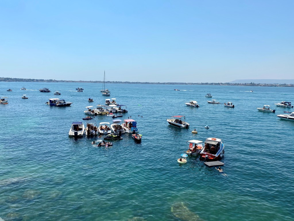 Giardini Naxos is only a few-hundred yards from Taormina as the crow flies – it is somewhat further down the hairpins of the Sicilian roads. This said, the vibe is very much different with many more locals than tourists on the streets resulting a calmer and more genuine feel, both on the streets and in the cafes, restaurants and bars. The calmer vibe was further improved by being a 200-yard walk to the beach, frequented almost exclusively by locals and Italian holidaymakers. Only early in the morning was the sea anywhere near refreshing in temperature. By mid-morning the shallows were tepid and, in the afternoon and evening, like swimming in a bath.