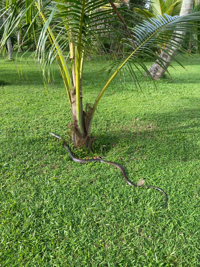 We had to quickly become accustomed to the wildlife in the hotel’s grounds. There were snakes, monitor lizards and bats to contend with as well as the usual predatory mosquitos which would arrive on the scene quite early, c. 5pm as dusk quickly slipped in to sundown at 5:45pm and by 6pm it was night. The hotel’s largest monitor lizard was about four feet long and, thankfully, was pretty shy and only seemed interested in digging up their lawn.