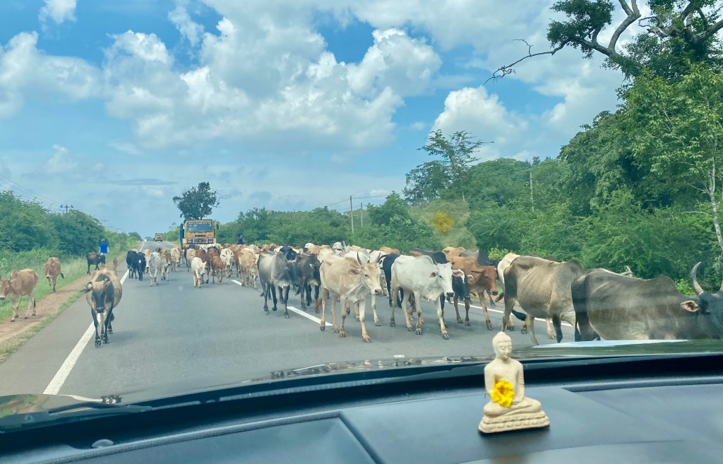 With the exception of a toll motorway which runs from Colombo to the south east of the island (the south of the island is where most of the tourists head), all roads in Sri Lanka are normal two-lane roads (one in each direction). The unofficial third lane for overtaking, which can go in either direction, is the middle of the road and is mainly used by the kamikaze bus drivers who go hell for leather between bus stops and have little regard for anything else on the road. The buses only yield for cows and buffalo which rule the road and seem completely nonchalant about the chaos they often cause.